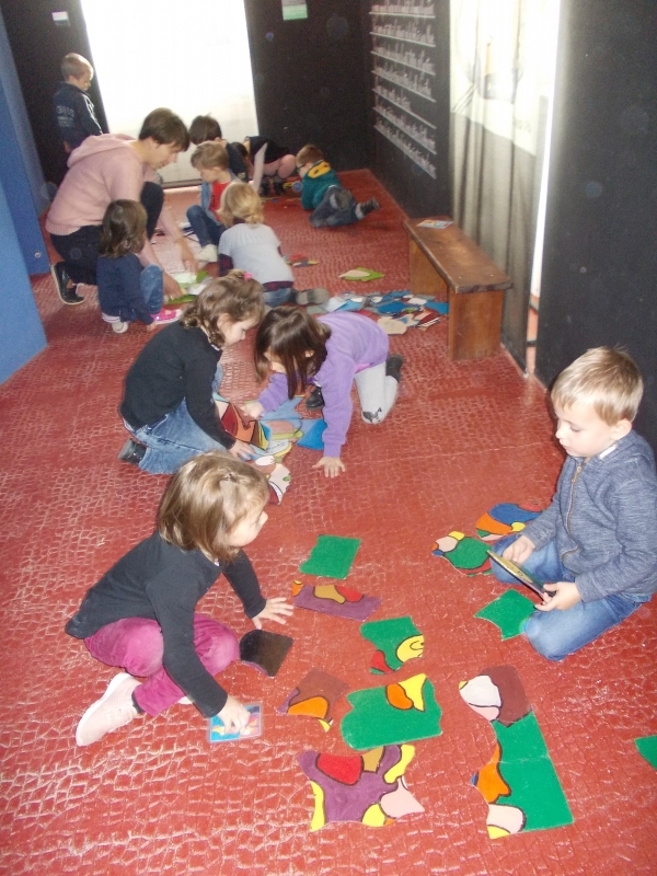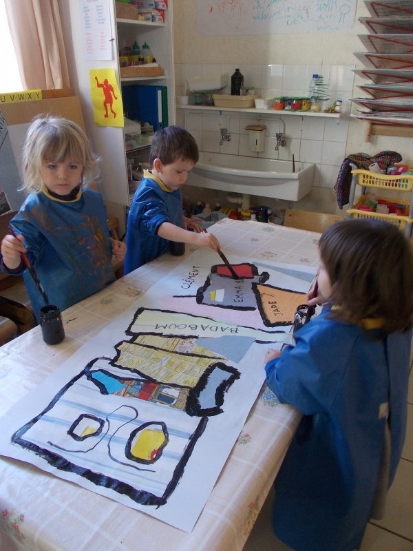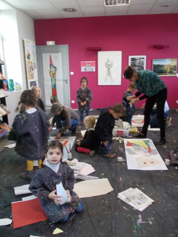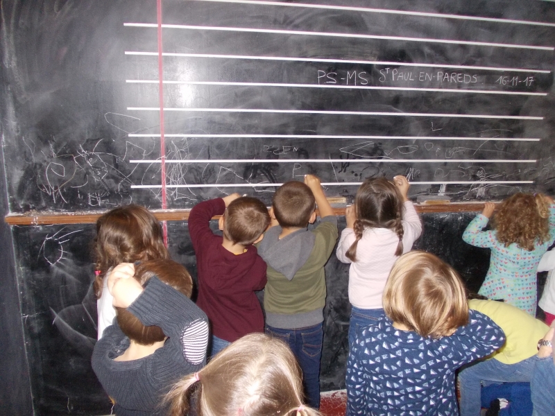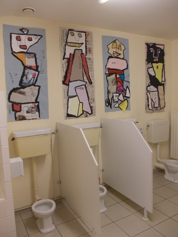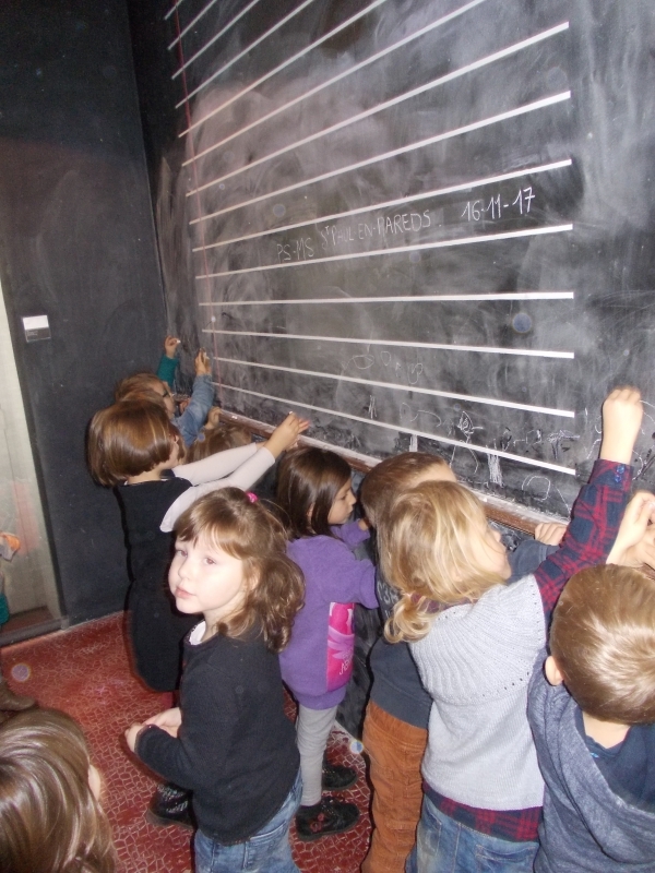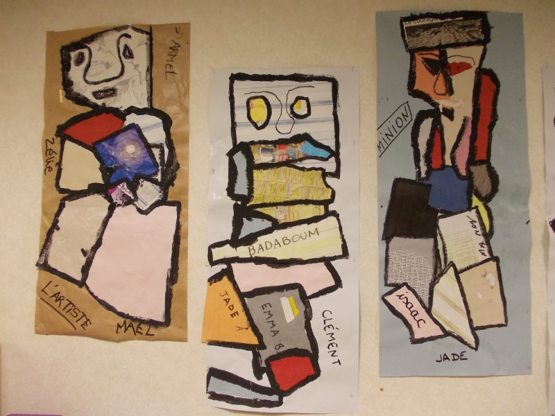 Le jeudi 16 novembre, nous sommes allés visiter l’espace Gaston Chaissac à Ste Florence. Nous sommes partis en car : pour la plupart d’entre nous , c’était une première ! Grâce à cette visite, nous avons découvert quelques élément de la vie de cet artiste et nous nous sommes familiarisés avec ses œuvres. En petits groupes, nous avons réalisé des bonhommes à la manière de Gaston Chaissac en assemblant et collant des morceaux de papiers. A l’école, nous les avons terminées en faisant le contour de chaque morceau de papier au pinceau et à la peinture noire. Nos œuvres  ornent désormais les murs de notre classe et même ceux de nos toilettes ! ( Petit clin d’oeil à G.Chaissac qui, en 1948, a lui même peint des bonhommes dans les toilettes de l’école de Ste Florence)