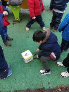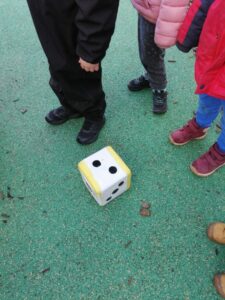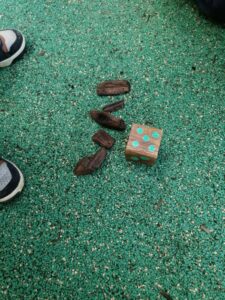 - 1/ numération : les enfants devaient constituer une collection de copeaux correspondant à la valeur du dé (jusqu’à 3 en PS, jusqu’à 6 en MS)