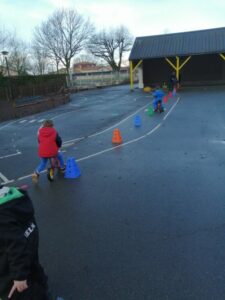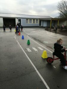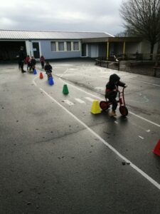 - 2/ motricité : slalom à pieds puis en draisienne :