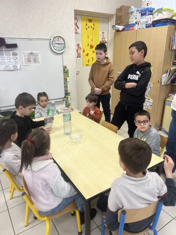 Jeudi 12 février, les CM1 et CM2 ont imaginé et préparé 7 énigmes scientifiques à faire résoudre aux autres élèves : comment faire flotter de la pâte à modeler ? Comment maintenir une balle de ping-pong sur une bouteille renversée ? Comment plonger un mouchoir dans l’eau sans le mouiller ? Comment séparer du sel et du poivre ? Comment traverser une feuille de papier sans en couper les bords ? Comment faire tenir une calculatrice sur une simple feuille de papier ? Et comment faire sauter du riz ?